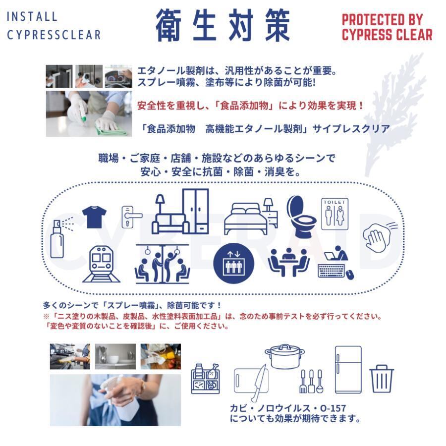 日常衛生管理に、高機能エタノール製剤 サイプレスクリアを推奨します。
